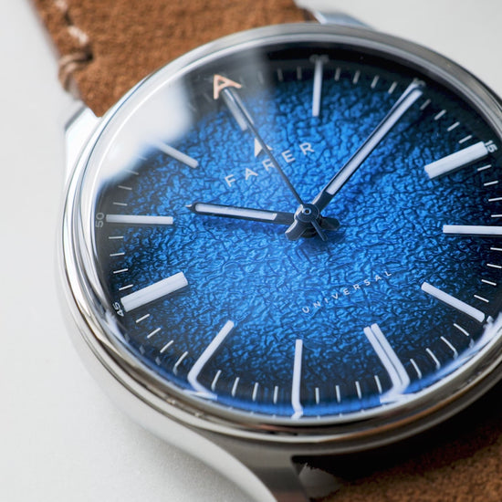The Venture blends metallic blues and a soft, crackled texture to create a watch that’s filled with intricate details. To achieve the Venture’s unique look, the dial is first pressed to give it its texture, then it is painted multiple times to create a smoky colour gradient that draws the eye towards the dial’s centre. A clear lacquer is then applied to the dial and polished to a glossy finish. As a result of this time-consuming process, the hour markers appear to float over the dial. They’re made from Lumicast, a blend of ceramic and Super-LumiNova, and are among the thinnest shapes ever to utilise the material. The pencil hands are painted a gloss blue and are also filled with Grade X2 Super-LumiNova. For a final touch, the blue seconds hand features a peach-coloured Farer ‘A’.